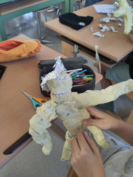 Dann wurde es dreidimensional: Die selbstgewählte Pose kam aufs A4-Blatt, wurde mit Alufolie nachgeformt, mit Papierklebeband umwickelt und Schicht für Schicht mit Zeitungspapier bekleistert. 📰✨